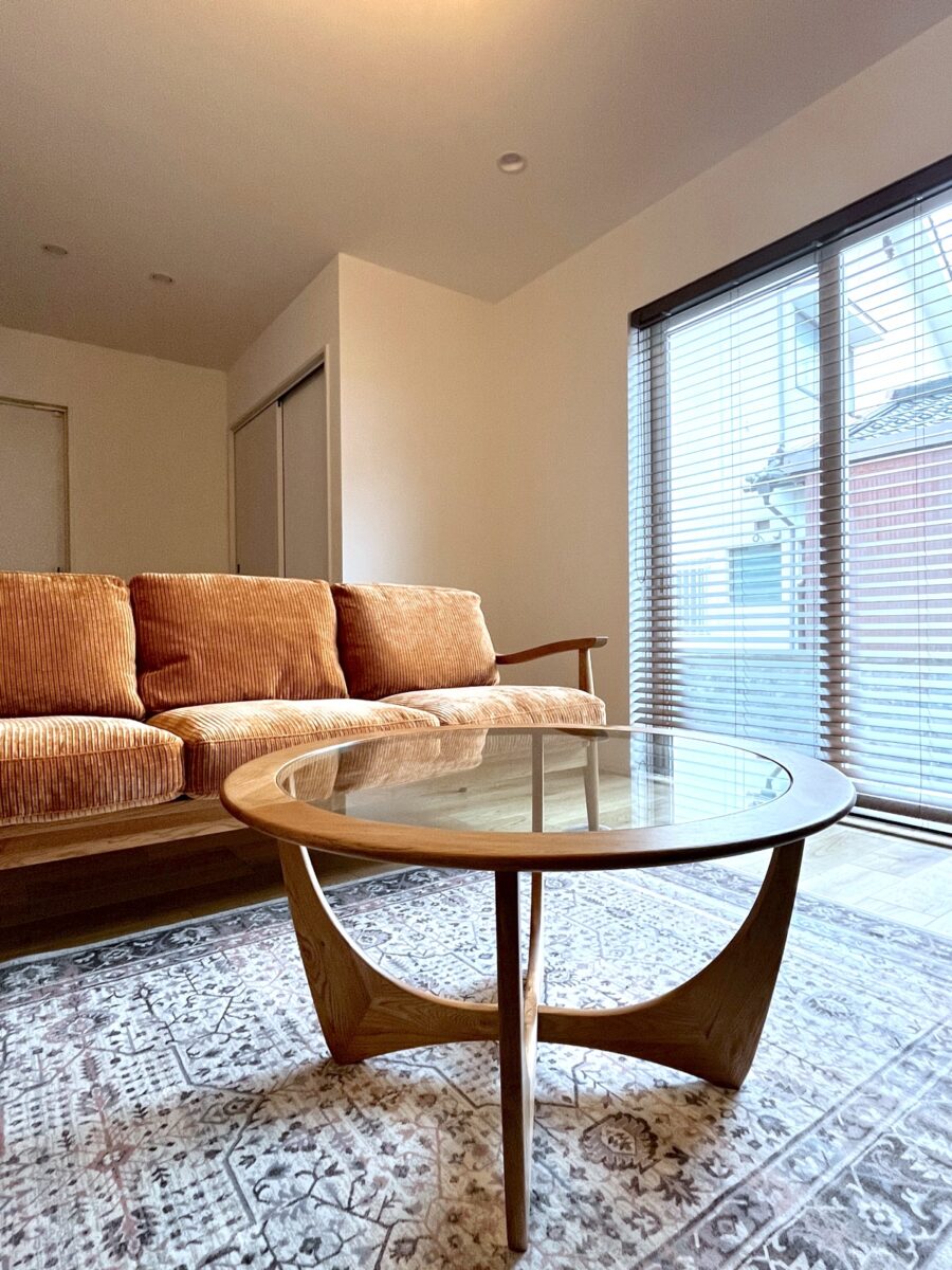 特徴的な脚と優しい丸みのセンターテーブルは、無垢材のフレーム+ガラス天板の組み合わせで、重厚感と抜け感を両立。
