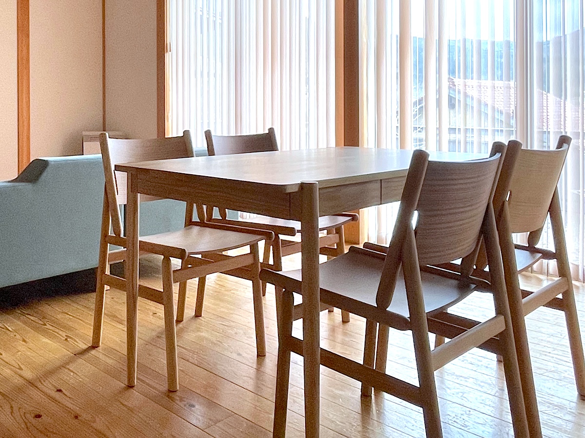 無垢材を使用したダイニングテーブルは、小物なども収納できる引き出し付で、