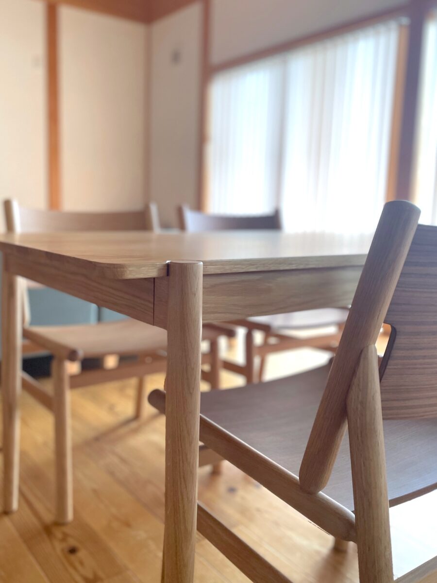 テーブルに合わせた丸みのあるデザインで、統一感のあるダイニングスペースに仕上がりました。